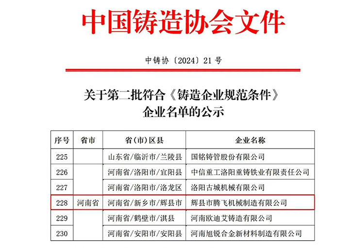 9月11日,中國鑄造協(xié)會(huì)官網(wǎng)公示了“第二批符合《鑄造企業(yè)規(guī)范條件》企業(yè)名單”,輝縣市騰飛機(jī)械制造有限公司榮登榜單。