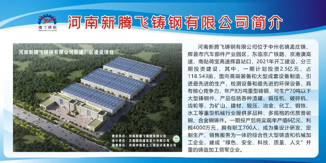 因鑄件產(chǎn)品供不應(yīng)求,為了更好服務(wù)客戶(hù),公司投資2.5億元資金,新建“河南新騰飛鑄鋼有限公司”,占地面積120畝,打造年產(chǎn)8萬(wàn)噸高 端裝備制造大型優(yōu) 質(zhì)鑄鋼件生產(chǎn)基地。